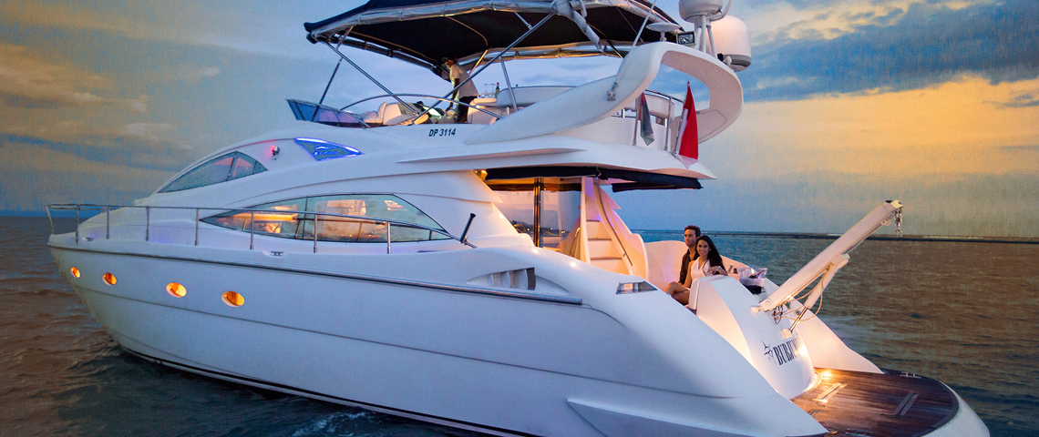 Burjuman is a glamourous 57.9 ft/17.6 m triple deck super yacht for up to 14 guests. This magnificent Italian crafted vessel is like having your own luxury apartment on the water complete with a spacious air- conditioned saloon lounge & dining area, fully equipped galley with stove, microwave, refrigerator & 2 luxurious en-suited master cabins + 1 twin cabin with separate bathroom.