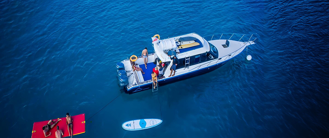Rhino is a 42 ft/13 m sports leisure & dive vessel for up to 14 guests custom built for speed, comfort, & versatility. Rhino features individual undercover banquette style seating down the sides of the cabin, open decks at the bow & rear, a rooftop level for lazing in the sun, as well as a freshwater shower, electric flush toilet & on- board sound system.